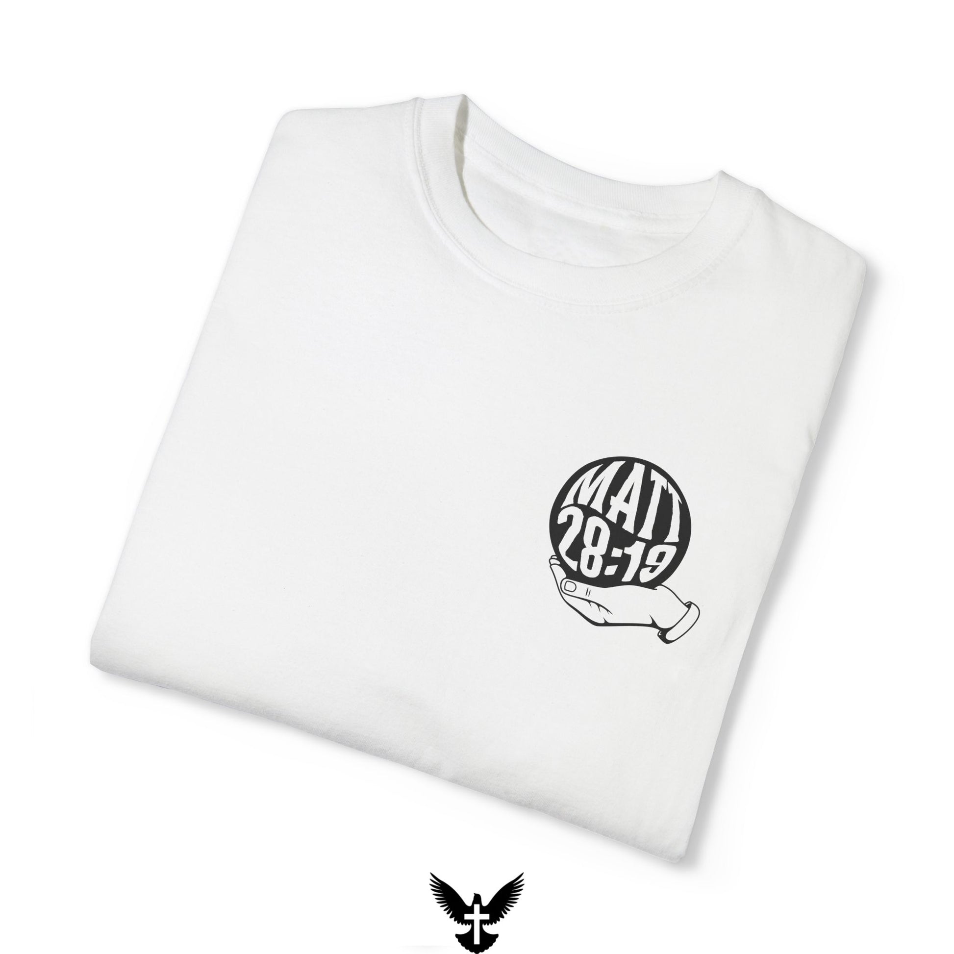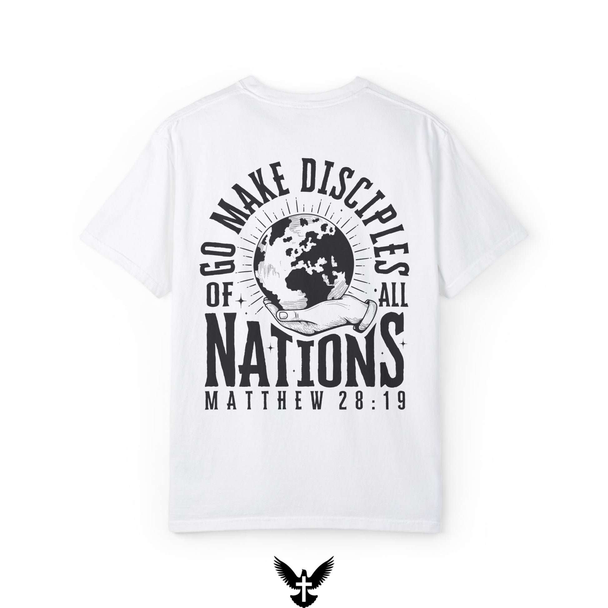 Embrace your faith and share the Great Commission with this lovely shirt featuring the inspiring Bible verse Matthew 28:19. This faith-based t-shirt showcases "Matthew 28:19" on the front left chest and an impactful image of the earth on the back, with the words "Go make disciples of all nations."